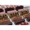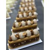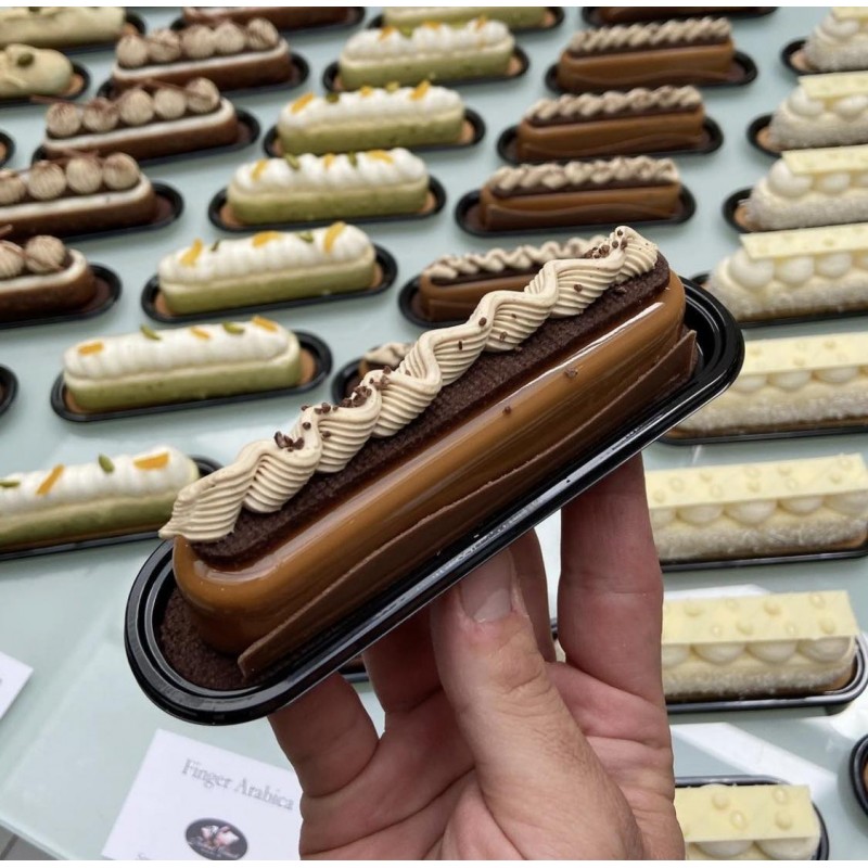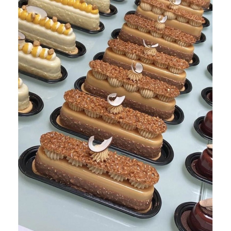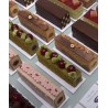 Arabica: Almond sweet paste, soft chocolate biscuit, chocolate ganache, milk chocolate and coffee mousse, coffee chantilly cream, milk chocolate glaze