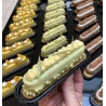 Pistachio and morello cherry cake tube: pistachio cakes, soaking syrup, bitter cherry compote, pistachio ganache, pistachio “rocher” glaze