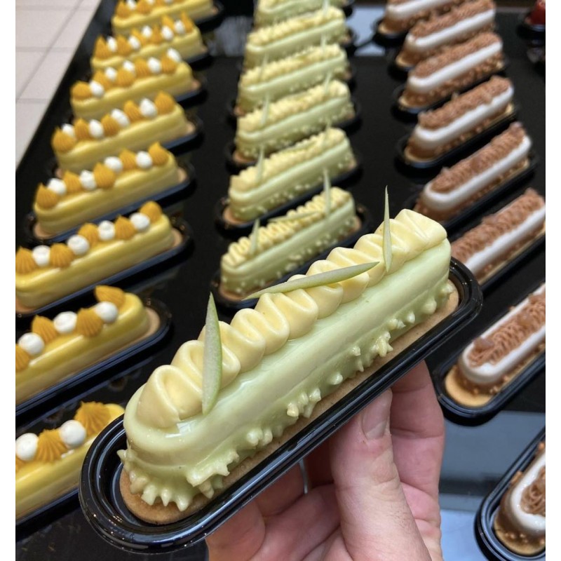 Caribbean: Almond sweet paste, soft pistachio biscuit, pineapple compote, light Caribbean mousse, whipped white chocolate and vanilla ganache, green "Spring" mirror glaze, pistachio “rocher” glaze