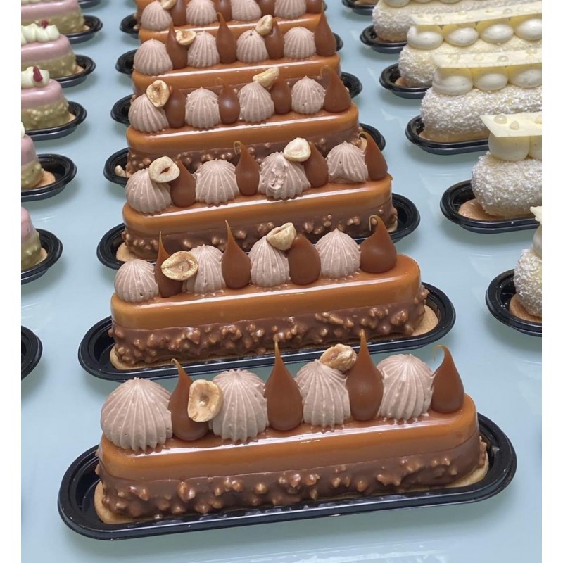 Caramelo: Almond sweet paste, streusel basic recipe, reconstituted streusel, soft caramel, "Carambar" Chantilly, caramel miror glaze, milk chocolate “rocher” glaze,milk chocolate Chantilly