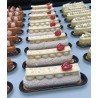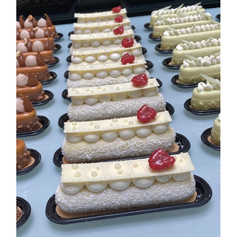 Raspberry: Almond sweet paste, soft intensely almond biscuit, raspberry compote, light vanilla cream, white chocolate and vanilla whipped ganache, white chocolate undercoat glaze.