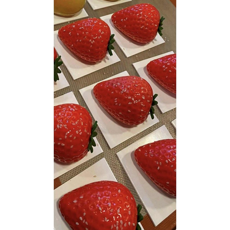 Strawberry: Almond sponge, strawberry compote (with baked and fresh fruit), strawberry mousse.