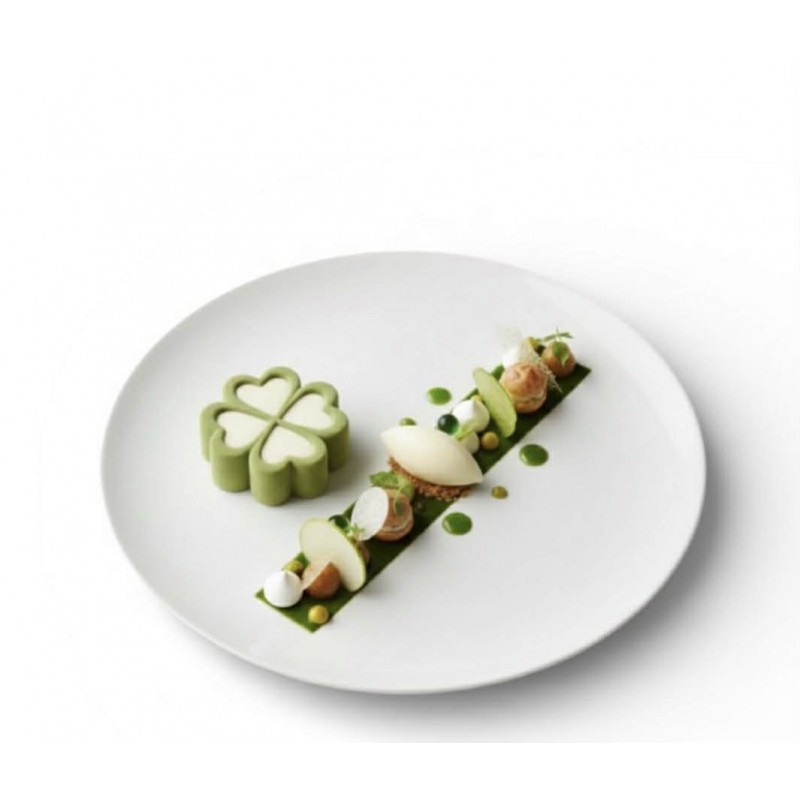 Plated dessert 4 - Smooth, shiny, compact pear center, deep green fresh droplet, small amber cubes, toasted crumble, thin veils, fresh leaves.