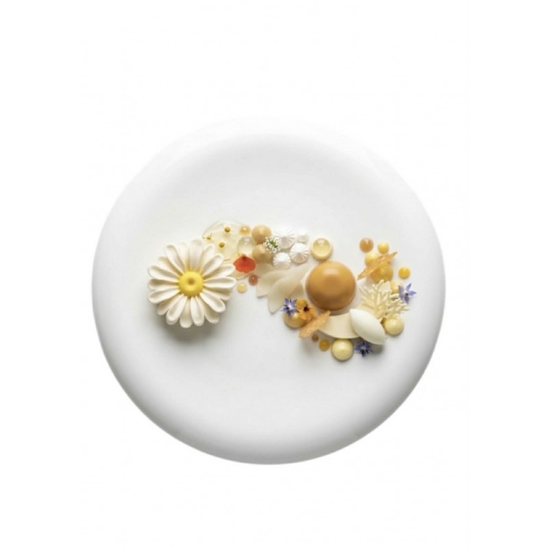 Plated dessert 7 - Caramel and citrus mousse sphere, light fresh quenelle, yellow and transparent gels, meringues and crumble.