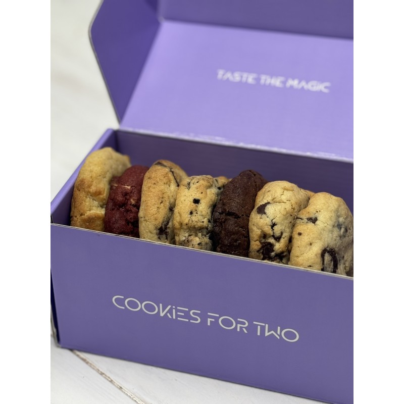 Incluye: 1 cookie de Biscoff®, 1 Chocolate Chip cookie & Nutella®, 1 cookie Red Velvet, 1 cookie de Limón, 1 cookie de Cacahuete Salado, 1 cookie Doble Chocolate, 1 cookie de Oreo®.