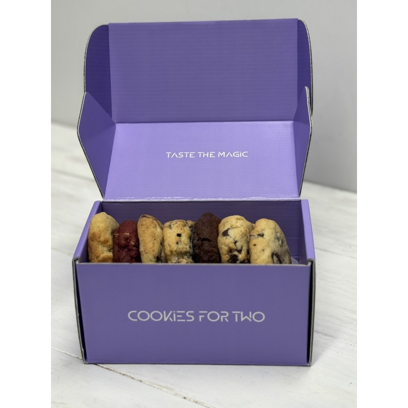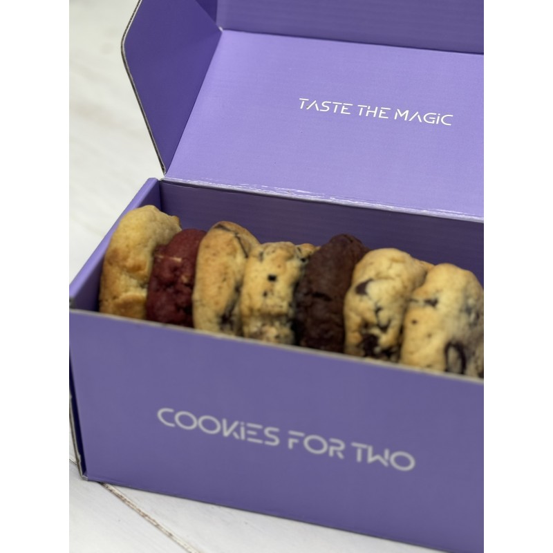 Incluye: 1 cookie de Chocolate Chips, 1 cookie de Biscoff®, 1 cookie Red Velvet, 1 cookie de Limón, 1 cookie de Cacahuete Salado, 1 cookie Doble Chocolate, 1 cookie Oreo®.