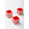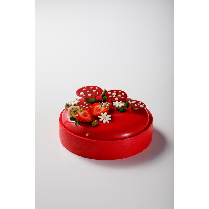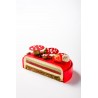 4) Fragolina (cubo): Capa crujiente de yogur, bizcocho de almendra, mousse de mascarpone y kéfir, mousse de fresa, confit de fresa, glaseado rojo