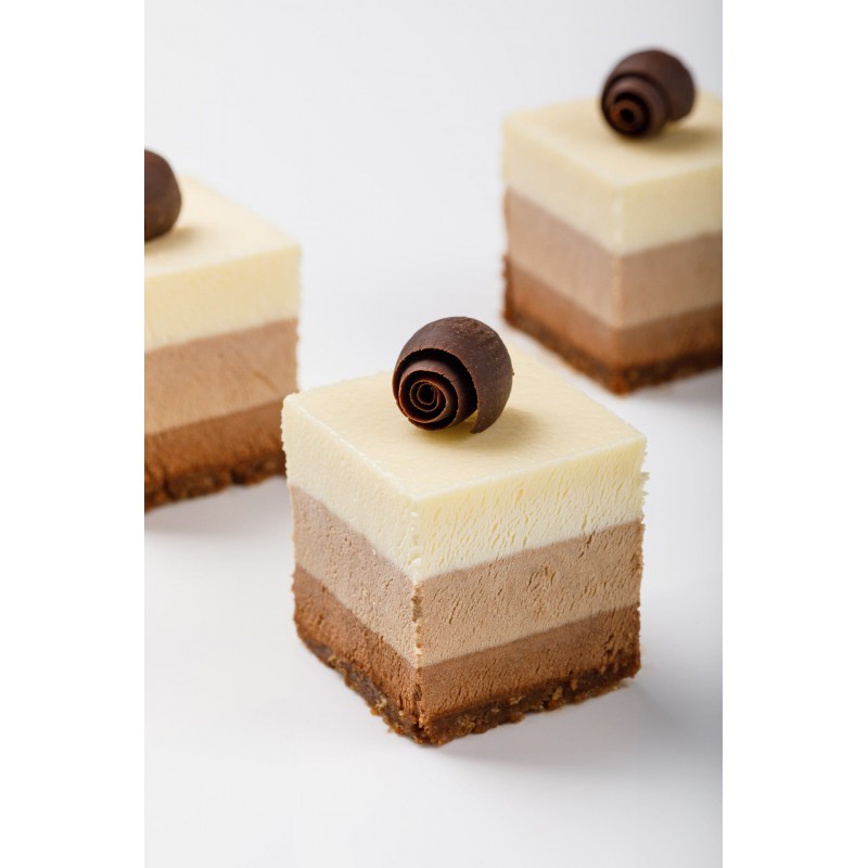 5) Three Chocolates (cubo): Bizcocho de avellana y cacao, bavaroise de chocolate negro, chocolate con leche y chocolate blanco, glaseado neutro