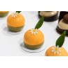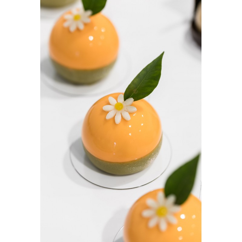 6) Burtuqal (sin gluten): Bizcocho de naranja y pistacho, compota de cítricos, mousse de naranja, glaseado espejo de naranja