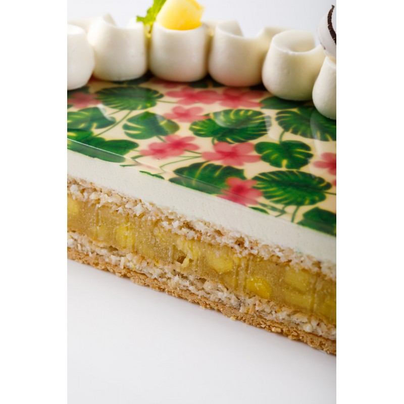 7) Piña Colada: Streusel de lima, daquoise de coco, compota de piña, mousse de coco, ganache montado de coco, transfer de manteca de cacao, glaseado espejo neutro