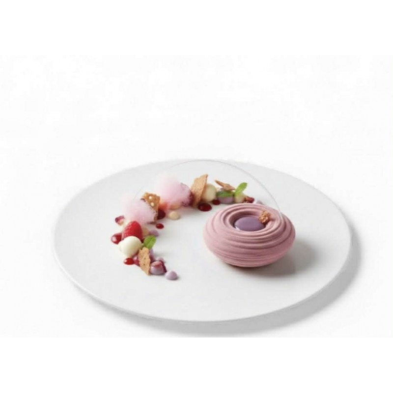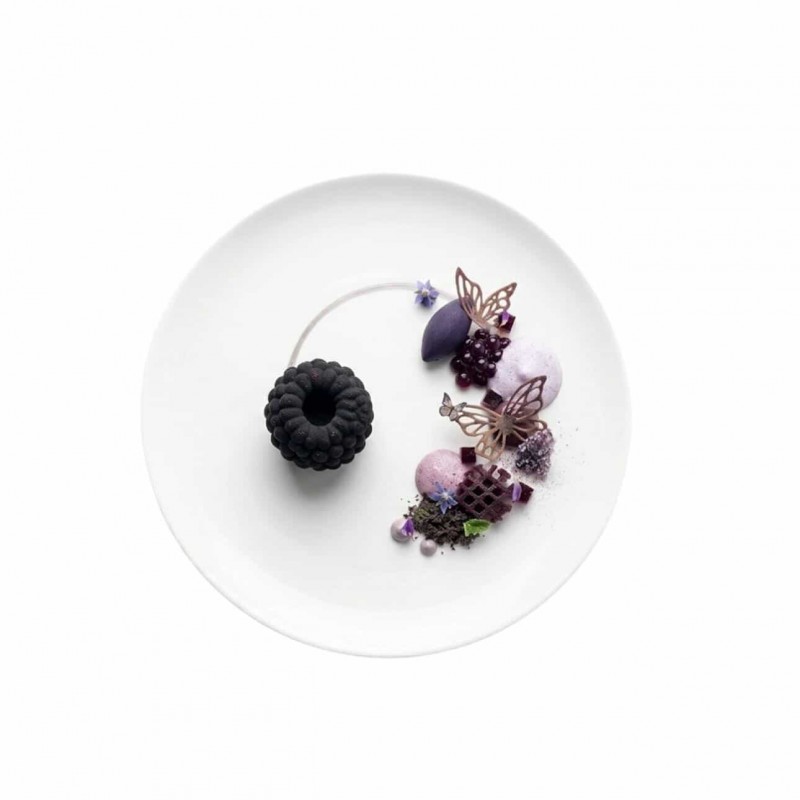 Postre en plato 2 - Mousse ligero e intenso de frambuesa y grosella negra, corazón de arándano y violeta, fresas frescas, gel de arándano rojo, crumble de almendras, perlas de chocolate blanco y menta.