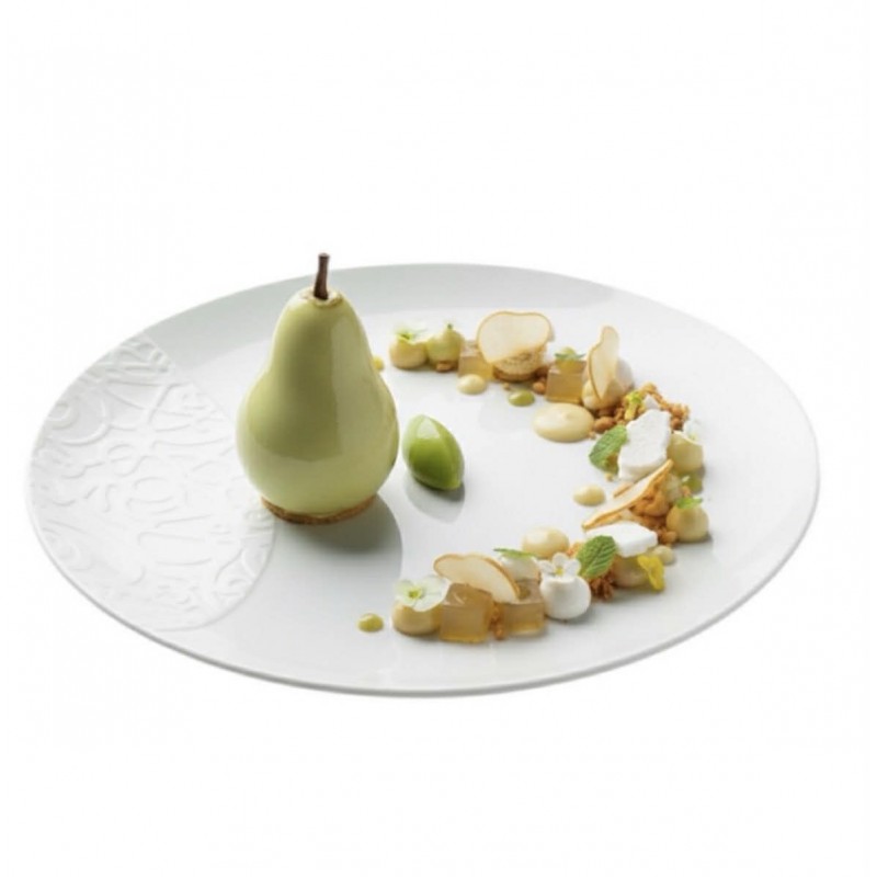 Postre en plato 4 - Centro de pera suave, brillante y compacto, gota fresca de color verde intenso, pequeños cubos ámbar, crumble tostado, velo y hojas frescas.