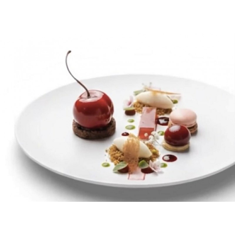 Postre en plato 5 - Gel de cereza, coulis de cereza fresca, cereza fermentada, crumble de pistacho, quenele de vainilla y fina teja de caramelo.